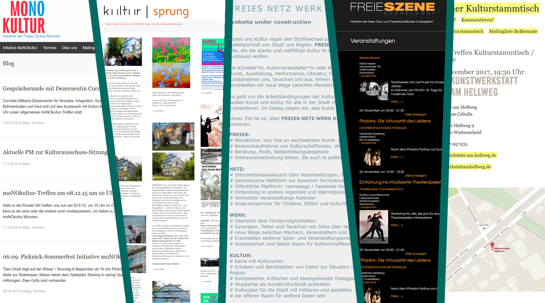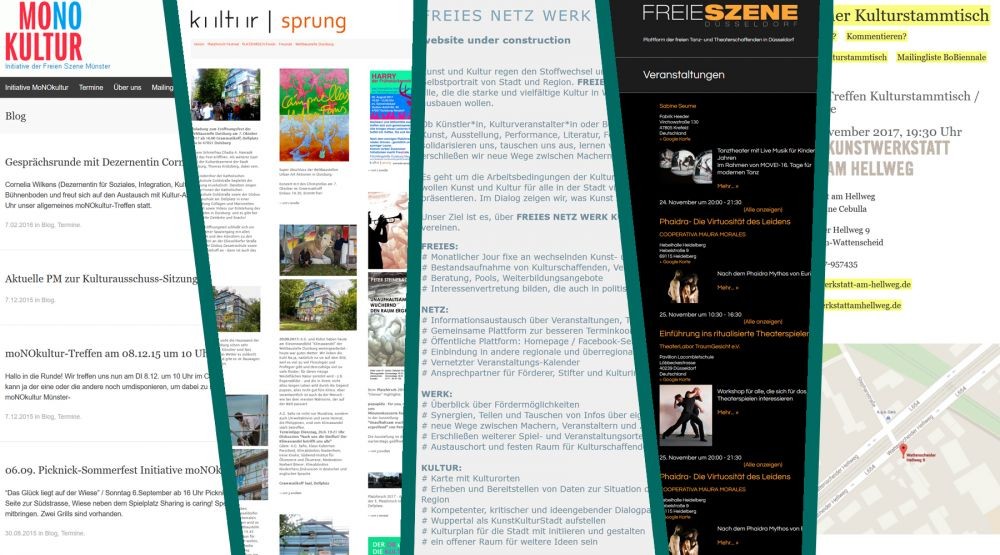 - Feedback-Panorama, Wuppertal: Das Freie Netz Werk Kultur in Wuppertal hat bei einem Treffen das Feedback von rund 40 Künstler*innen und Kulturschaffenden zur Kulturtrasse 2017 gesammelt. Anschließend hat die Initiative die Ergebnisse sortiert und der Stadt als kollektive Rückmeldung zum Kulturfest überreicht.