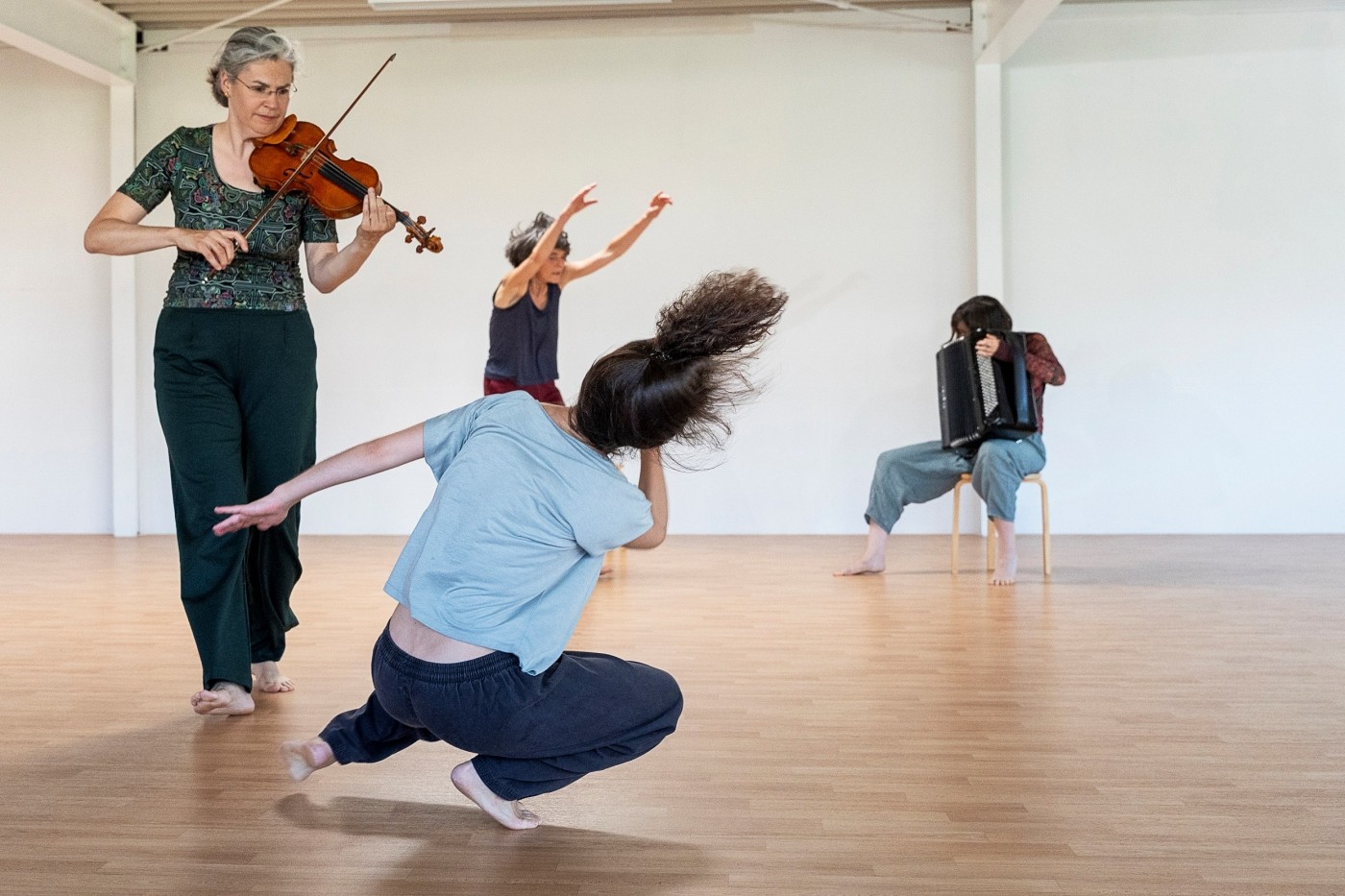 Neu im Team sind in „Leise schäumt das Jetzt #2“ Hannah Weirich und Neus Barcons Roca. Weirich ist in Köln als Violinistin innovativer Kompositionen im Ensemble Musikfabrik bekannt ebenso wie Barcons Roca als herausragende Tänzerin bei Britta Lieberknecht und Mouvoir. Sie waren bereits im Duo im Acht Brücken | Musik für Köln Festival 2018 als Interpretinnen von B.A. Zimmermanns Sonate für Violine zu sehen. Nun begegnen sie sich im freien grenzüberschreitenden Spiel. Und interagieren mit den bereits in „Leise schäumt das Jetzt #1“ bewährten Partnerinnen Britta Lieberknecht, experimentierfreudig mit langer Geschichte in der Avantgarde der Tanzperformance und Eva Zöllner, weltweit agierende Akkordeonistin, die mit einem außergewöhnlich reichen Klangspektrum spielt.
