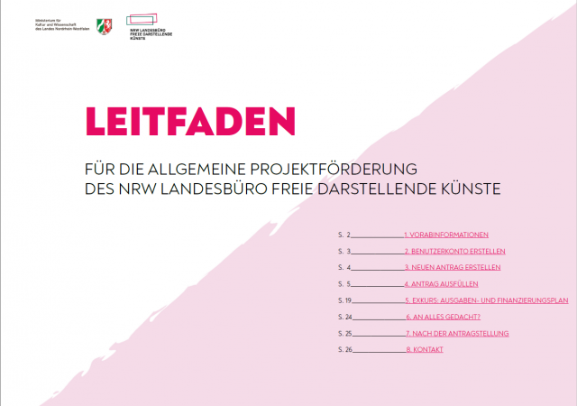 Der "Leitfaden für die Allgemeine Projektförderung des NRW Landesbüro Freie Darstellende Künste" beantwortet viele Fragen zur Allgemeinen Projektförderung und gibt Orientierung von der Antragsplanung bis zur Einreichung.