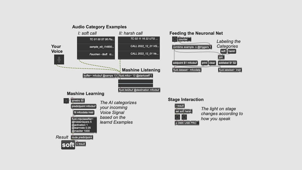 Im Versuchsaufbau des Workshops reagiert ein neuronales Netzwerk auf einen Bühnendialog. Wir werden das neuronale Netz trainieren, so dass es die jeweiligen Sprecher*innen und einige ihrer charakteristischen Sprechintensitäten sowie bestimmte Wörter klassifizieren kann. Mithilfe der Software Max 8 kann auch komplexes Bühnenlicht gesteuert werden.