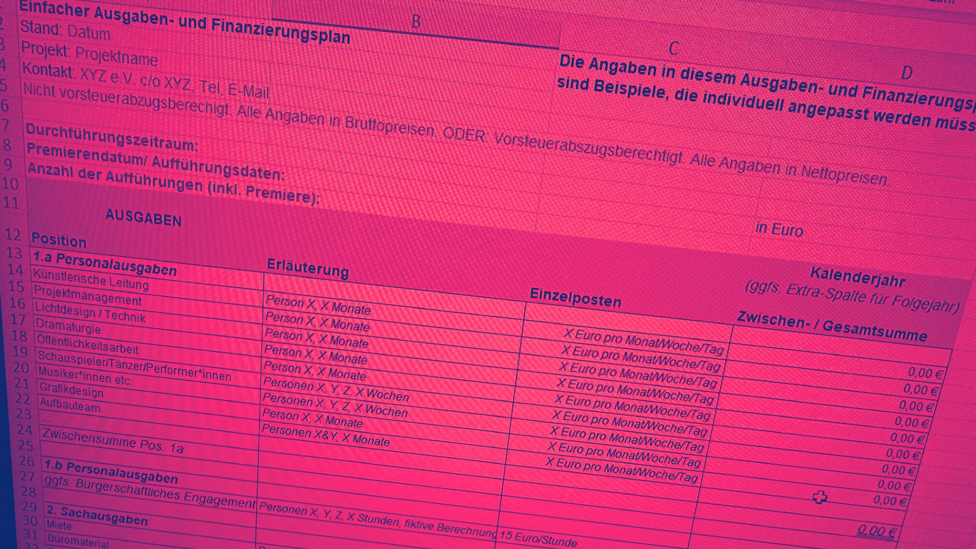 Ausgehend von einem fiktiven Künstler*innenkollektiv und mehreren Beispielproduktionen innerhalb eines Kalenderjahres erarbeiten die Teilnehmer*innen eine Budgetmonitoring-Vorlage, die aus mehreren Kosten- und Finanzierungsplänen, aber nur einer zentralen Belegerfassung besteht. Im Workshop entsteht damit ein Budgetmonitoring-System, das für die Betreuung von Kollektiven und Einzelkünstler*innen mit mehreren Projekten z. B. für Produzent*innen hilfreich sein kann.